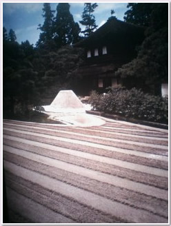 同じ室町時代に作られた金閣寺と銀閣寺にも大きな意味、象徴性が隠されている。金と銀、太陽と月、昼と夜、明暗、陰陽など、日本文化は常に2つの世界の対比、すなわち二元論的世界観が基本になっている。金はもとより宝であり、冨の象徴であり、精神的には阿弥陀浄土の色彩である。反面、銀は渋く、それでいて高貴な色彩をおび、いぶし銀という言葉に代表されるような、渋く控えめな光沢を持っている。金を代表する建築物が金閣寺で、銀を代表する建築物が銀閣寺である。ところが金閣寺には金が貼られ、黄金色に輝いているが、銀閣寺には銀はどこにも貼られていない。木造の単なる書院造り。義政に銀を貼る財力がなくなったからだとかの理由がまことしやかに伝えられたが、銀閣には元々銀が貼られる予定はなかった。それは何故かというと、銀閣は銀、すなわち月の光、夜を象徴する寺だからである。門を入ると、銀閣の手前に白い盛り砂の「銀沙灘(ぎんさだん)」がある。そして銀閣と銀沙灘の間に向月台がある。この向月台の形は円錐型の上三分の一を横に切り取った形をしている。