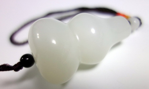 さて私の持つ白玉で現在お見せできるレベルのものは2種類あります。一つは龍の子供、稚龍の彫刻の入ったやや大き目の置物ですが、これは若干白みに欠けます。もう一つ、瓢箪形の白玉は小さいですがほぼ理想に近い白さです。これが本来の羊脂玉といえるでしょう。写真から感じをつかんでみてください。じつに肌触りのよい、とろっとした感触です。玉の鑑定方法は写真では難しいため、また別の機会に実物を観ていただきながらお話ししたいと思います。