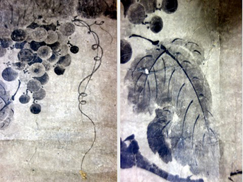 その描きかたが今回の狩野元信の葡萄図の葉に同じに描かれています。葡萄の図柄全体の描きかたが非常に似ています。似ているというより、鍋島の原図を宮廷絵師である狩野派に依頼したか、後に同じような図柄の絵を手にして模倣した確率はかなり高いと思われます。その証拠がもう一点、蔓の描きかたです。