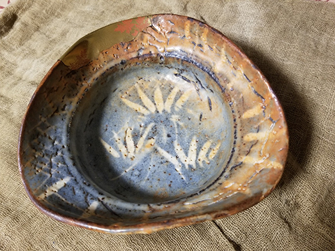 その浸した鉄釉を引っ掻いて白い絵を描き出し、白い長石釉を掛けて焼きますと、鉄釉の黒に白い長石釉がかかり、中間の鼠色になります。そのため「鼠志野」と呼ばれ、更に数が少なく、ために茶人に珍重され取引価格も高額になりました。私は現在鼠志野は、陶片を除き三品所有しています。