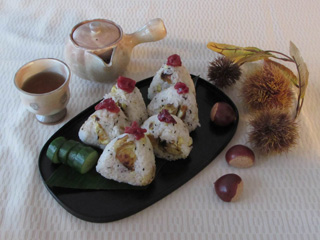 - 6.を普通に炊き、炊き上がったら栗を含めて100g位のおにぎりにします。