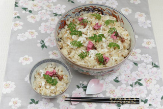 - 器に盛り、あれば塩漬けした桜の花と木の芽を添えます。