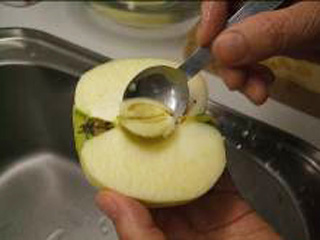 - リンゴは縦半分に切って皮をむき、スプーンで芯を丸く取り除き、塩水にくぐらせます。