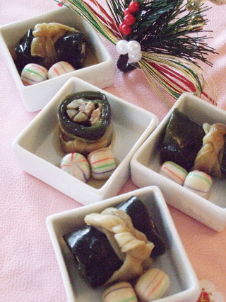 - 昆布は「よろこぶ」、巻きは「実を結ぶ」を意味し、おめでたい食材として祝いの折りには欠かせない食材です。