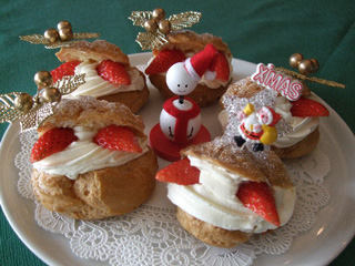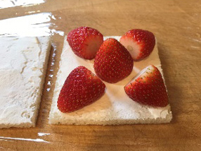- 3.のパン(2枚)の中央にイチゴを1つ立て、その周りに4つのイチゴを、先がパンの角に向くように置きます。(写真参照)