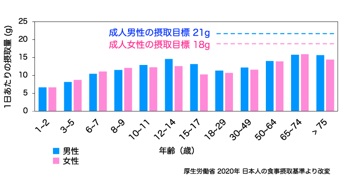 食物繊維の日本人の摂取目標は成人男性で21g、成人女性で18gだが、どの年代も不足している。