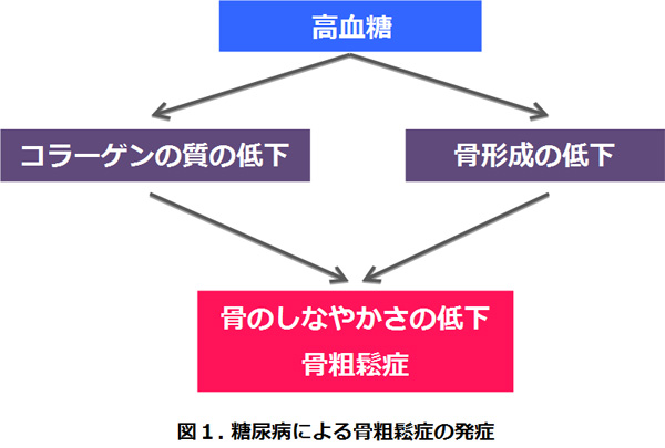 骨にもしなやかさが必要であり、コラーゲンは骨のしなやかさや骨のスムーズな動きを助ける作用があります。糖尿病の患者さんでは、骨形成の低下に加えてコラーゲンの質が低下することから、骨のしなやかさが失われ、骨粗鬆症になりやすいこともわかってきました(図1)。
