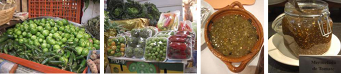 写真:左2枚は、市場で売られているさまざまなトマトとチリ(唐辛子)、右から2枚目は青いトマトを使ったサルサソース、右は青いトマトのジャム
