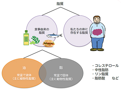 食事由来の脂質は、オイルあるいは油脂とも呼ばれます。油脂は、サラダ油やごま油のように常温で液体のものと、バターや肉の脂身のように常温で固体のものに分けられます。前者の常温で液体のものは、主に植物性の脂質であり、「油」と言います。一方、後者の常温で固体のものは、主に動物性の脂質であり、「脂」と区別することができます(図1)。