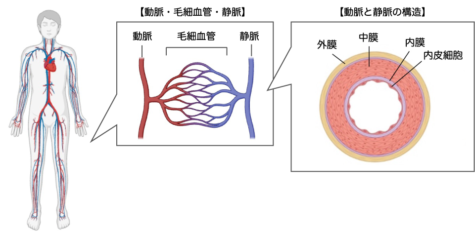 血管は、動脈(赤)、静脈(青)と毛細血管から成り立つ。さらに、動脈と毛細血管の間を細動脈、静脈と毛細血管の間を細静脈と呼ぶ。血管の壁は、内皮細胞と結合組織から成る内膜、平滑筋と弾性線維から成る中膜、最も外側の外膜という3層構造をとっている。さらに、静脈には血液の逆流を防ぐための静脈弁がついている。