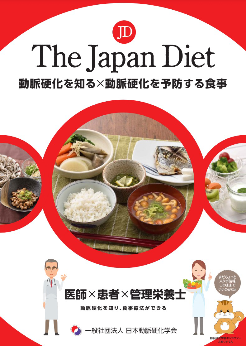 日本動脈硬化学会は、動脈硬化の予防に役立つ食事として、日本食パターンの食事(The Japan Diet)を推奨しています。医師から動脈硬化のリスクが高いと言われたら、「The Japan Diet」を参考に、医師や管理栄養士と相談しながら食事療法に取り組みましょう(j-athero.org/jp/general/9_japandiet/)。