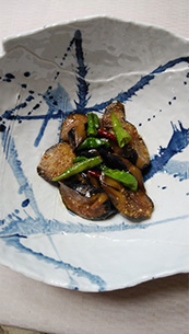 - 茄子はへたとお尻の部分を少し切り、ピーラーで皮を縞模様のようにむき、縦半分に切り、それを1.5cmくらいの斜め切りにして、水に1分ほどつけ、水切りしてキッチンペーパーで水気をとります。万願寺唐辛子は斜めに4等分して種を出しておきます。