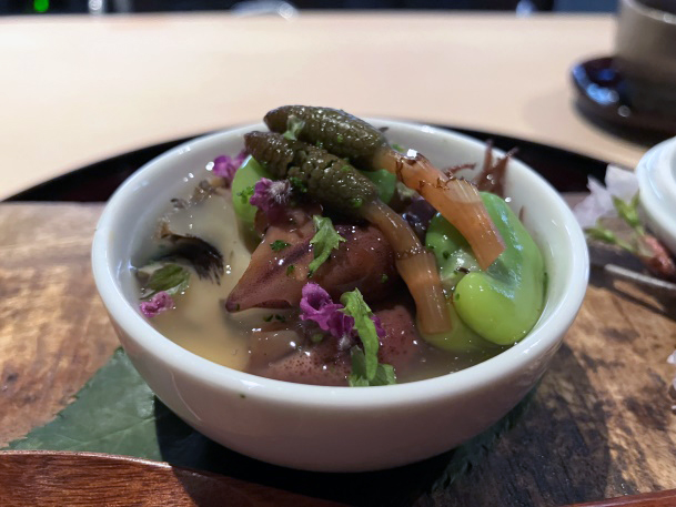 先付 卵豆腐 アワビ ほたるいか そら豆 土筆