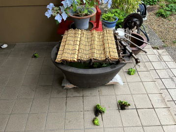 皆さん猫とかスズメあるいはカラスと思われると思います。わたしもそうだと思いたいのですが、写真のように上にかけてあるよしずはそのまま少しも変っていません。