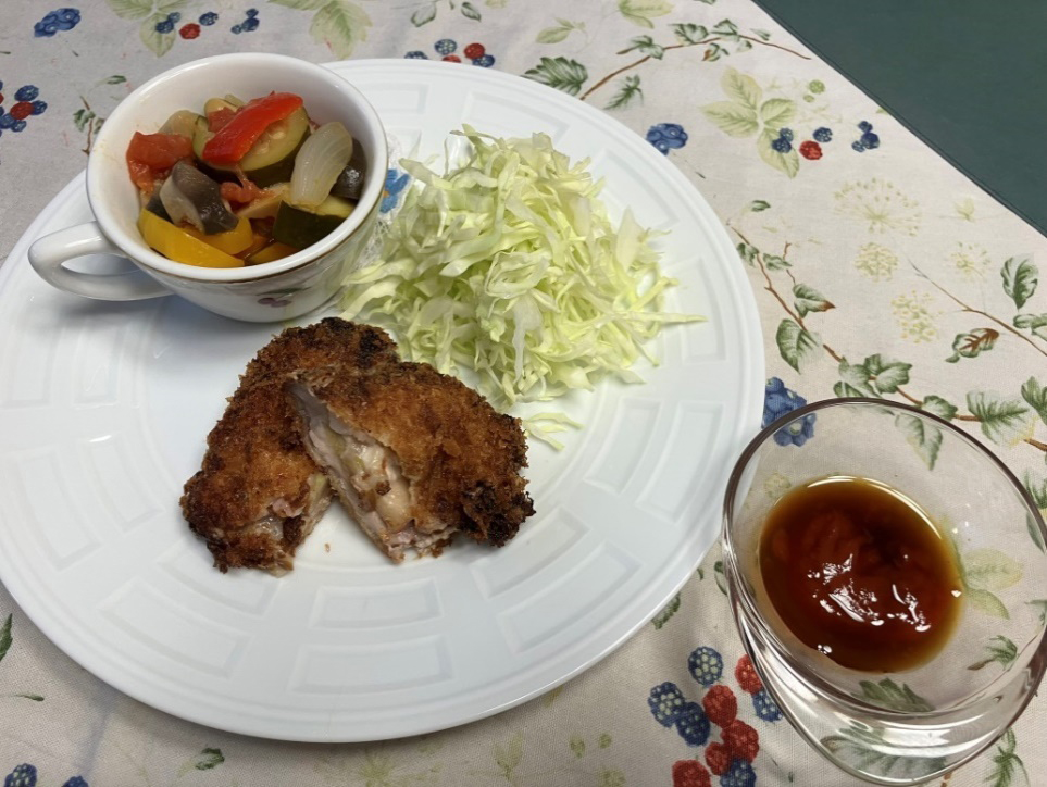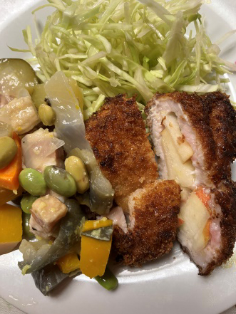 - フライパンにサラダオイルを3cm位入れて5を中火で片面2分くらい揚げ焼きし豚肉に火を通します。
