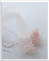 同じ長さの2種類のオーガンジーリボンを程よく重ね合わせ、針と糸でザックリ縫い、1.で準備したビーズリボンの中の1粒に針と糸を通し、リボンに縫い込んでいく。