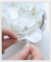 - パール(3mm)をUピンでオアシスにとめ、端はグルーでしっかりとパールが落ちないようにして、アレンジします。