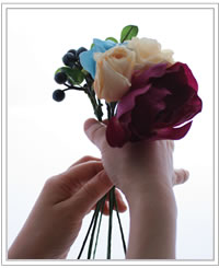 2本目は左手で支点を支えながら、ワイヤリングした花を1で持っている支点に手前から合わせて、左斜めになるように加えます。