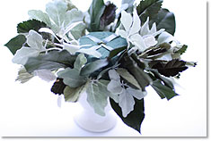 フランスの街を歩いていると、「周りを葉で囲んだブーケ」を手にしたオシャレな女性を見かけます。 そんなフレンチテイストの ブーケ風の器のアレンジを楽しみます。 |