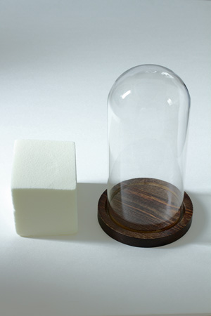- ガラスドーム内部の底面の面積よりも小さめに、また厚さは2センチほどにして、白いオアシスをカットし、面取りをしておく。
