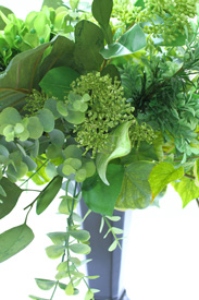 今回は、緑だけの花材を用いてのアレンジですので、葉のいろいろな形を活かして、グルーピングなどをして、横に流れをだしたりして、特徴のある形のアレンジに挑戦します。
