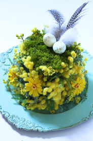 - 上面のアイスランドモスの一か所にほぼまとめて、たまご、羽(ホワイトコキール、ほろほろ鳥)をアレンジ。(羽はグルーをつけて接着)