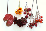 例えば、7時の方向に大きなお花をあしらい、12時~2時半の方向には動きを抑えて、アジサイを敷き詰め、所々実もので多少の抑揚をつけて。