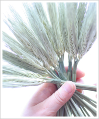 (この場合、ちょうど茎の長さの半分のところ。切った茎の下半分の部分は、後ほど使用)- 3.の作業が終了したものを、右利きの場合、反時計まわりに、フローラルテープを巻いた場所を重ねながら、常に前に重ねた大麦の小束より左側に斜めに位置するように重ねていく。