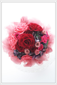 - ラウンド型で丸く、と言ってもぴったり同じ高さにするのではなく、多少の高低差をつけると動きのある華やかなアレンジとなります。
