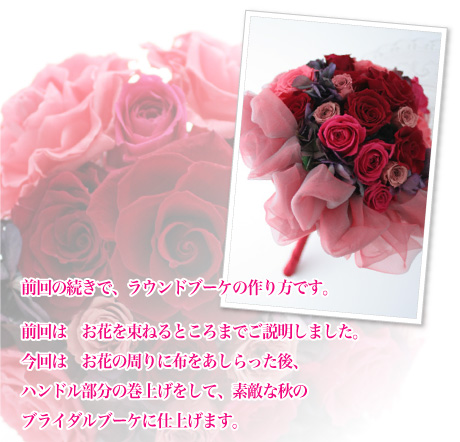 束ねたラウンド状のお花の周りに丁寧に、動きをだしながら(布の向き、多少の高低差をつけてあしらいます)アレンジをしてゆきます。