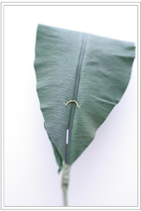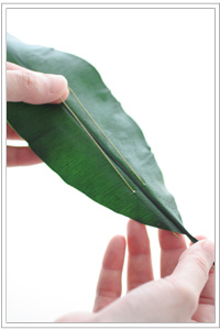 (2)葉の表側から、U字状(フック状)に曲げた#24地巻きワイヤーを葉脈をはさんだ位置から挿し通します。