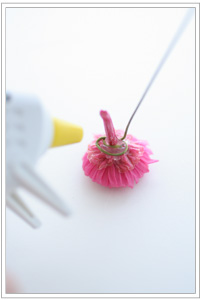 注:マムは大小を問わず、上部または下部から花の中に向けてフック状のワイヤリングをするときがありますが、プリザーブドフラワーの場合、菊科の花は花びらがとれやすいので、相当上手に挿さないと、力がかかり過ぎて、花びらがとれてしまいます。ですので、以下のツイスティングがお薦めです)