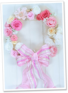 ウエディングのときに、ウェルカムボードはよくありますね。それもとっても素敵ですが、今日はちょっと志向を変えて、ウェルカムリースを創ってみましょう。 春らしい、ピンクを主体としたリースです。 |