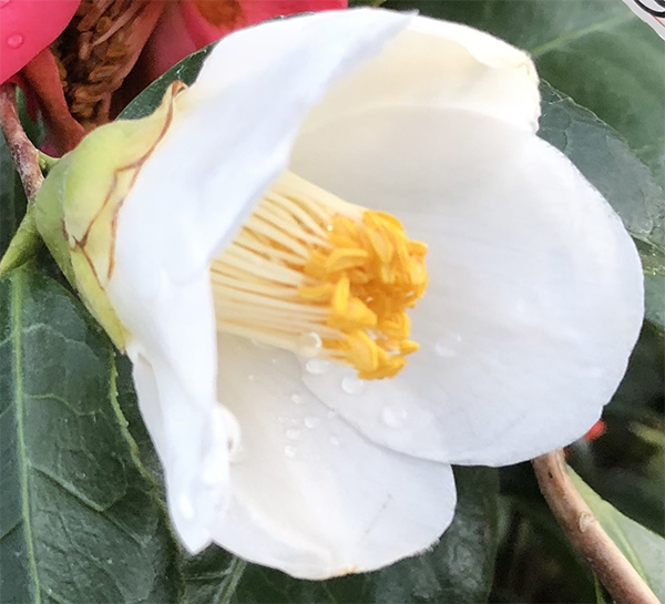 「細雪」 侘助タイプの筒咲きの白花。侘助は花粉が未発達で白いです。「師人」(もろびと)に似た花です。