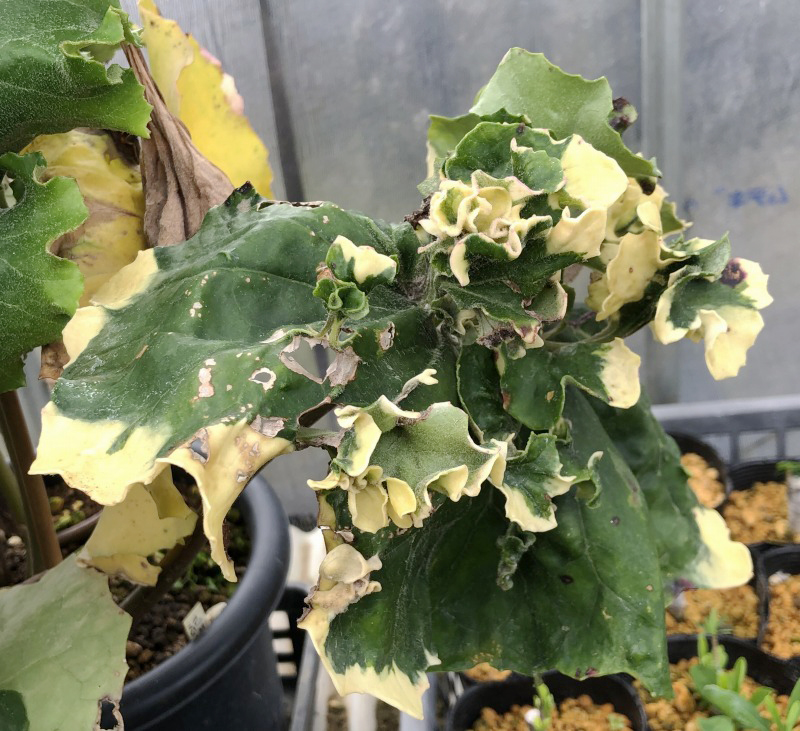 「紀州獅子斑入」・・・葉の表面に、突起状の葉が出る珍しい品種です。突起状の葉の事を子宝と言います。