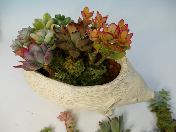 苔玉を作る時のように、それぞれの株をミズゴケとアートミズゴケ(人工のミズゴケのような糸)を使って根巻きをします。砂などの用土を使わないので、植え込む株の配置(レイアウト)が自由に出来ます。