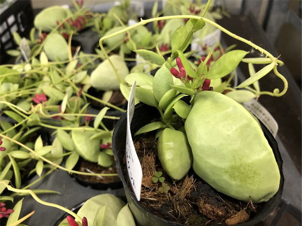 大きく膨らんだ葉からカンガルーポケットと名付けられました。着生種ですから乾き気味に育てます。「アリ植物」とも言われ袋状の葉にアリが棲みつくといわれています。