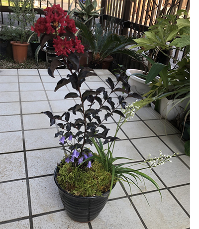 今回は、カラス葉のサルスベリが気に入って、寄せ植えを作ってみました。
