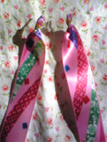 | (6)お正月用リボン 2本のリボンの先をワイヤーで巻きつける。 |