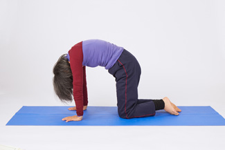 (1)1枚目の写真の姿勢のように四つんばい、息を吐きながら腹をへこませ、背中を丸く突き上げ、頭を両腕の中へ。