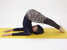4.手を床につけたまま、足先を頭の上の床に静かに下ろし、10呼吸キープ。(足先を遠くに伸ばすように。頭は傾けない。のどを締める。手は広げない。)