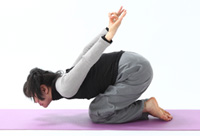 - 膝の内側に肘を当てて合掌する。腹式呼吸でポーズを保ちます。