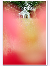 レンズに花を近づけることで柔らかな色フィルターのような役目をしています。ピントは後ろの白い建物に合わせています。単純な画面構図になるのを色のバランスで雰囲気を変えています。