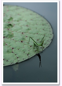オニバスの上になぜかバッタが一匹、これ以上前には進めませんから近づいてもじっとしています。水面に見えているバッタの顔がポイントです。