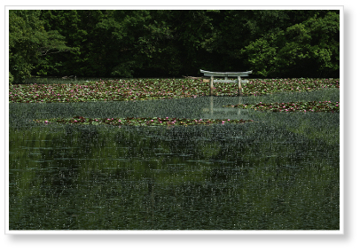 滋賀県の大地寺に隣接する弁天池の沈み鳥居の周りに咲く睡蓮の風景です