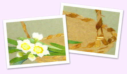 花や風景などは和紙の毛羽の乱れをそろえて貼ります。 |