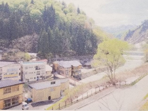 月山から流れる銅山川の美しい肘折(ひじおり)温泉郷の景色