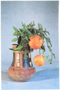 この橙は、後世「橙(ダイダイ)」に「代々(ダイダイ)」を音通させて、先祖代々などの言祝を意するものとして、正月の注連 飾りとして欠くことの出来ない果実として重し賞愛されております。
