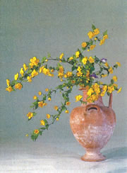 そんな山吹の瑞々しい風姿を、古代ギリシャ土器瓶に挿け表わした作品を図版[I]から、そして、いけばな古書『早満奈飛 』図版[II]も合わせて参照して下さい。