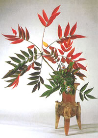四方に葉を広げたものに、嫁菜の花を出会せて、紀元10世紀頃のコスタ・リカの凛とした三脚土器に挿花した作品を参照して見て下さい。